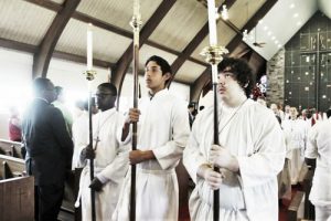 An ancient term meaning a companion, attendant, or helper. In modern worship, our acolyte guild is comprised of youths ranging from grades 3 through grade 12. However, this ministry is not restricted to youths. Our acolyte master can be seen from time to time in robes serving at the altar. Typically, the acolytes participate in the liturgy by leading the processional of the choir and clergy, carrying the cross and torches. They also assist in the preparation of the Eucharist and the tradition of washing the c
